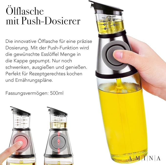 Non ne puoi più di avere a che fare con ricette che recitano “un cucchiaio di…”? Con questo dosatore da mezzo litro basta premere e la quantità di condimento desiderata fluisce nella testa di dosaggio. Un accessorio carino, utile e perfetto come idea regalo.